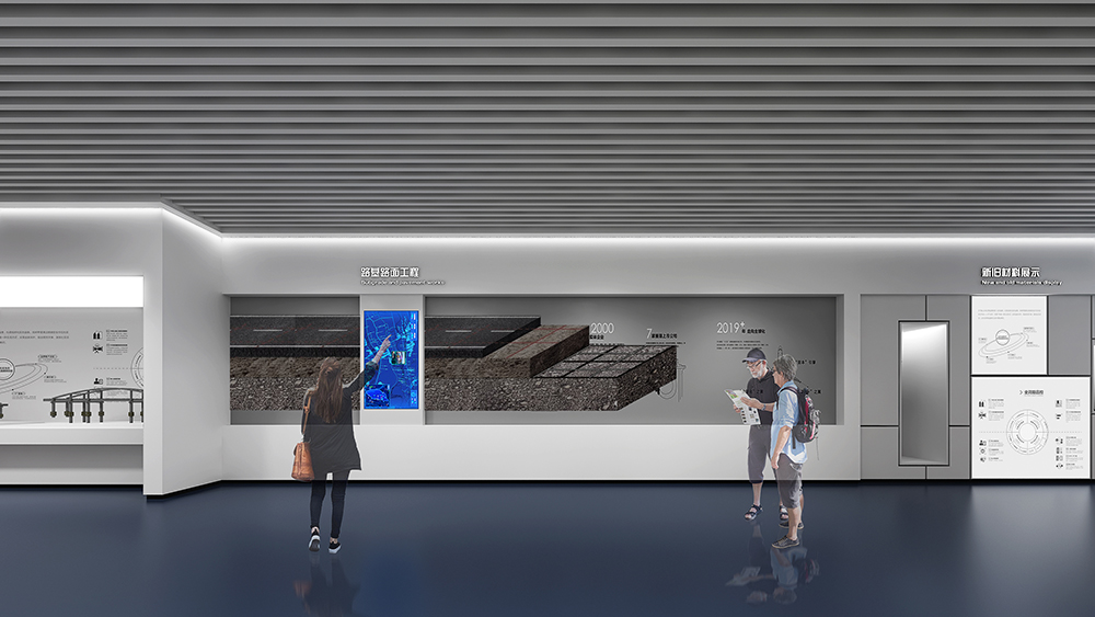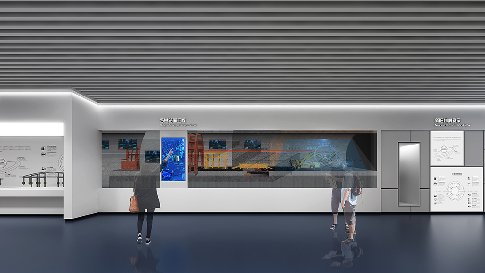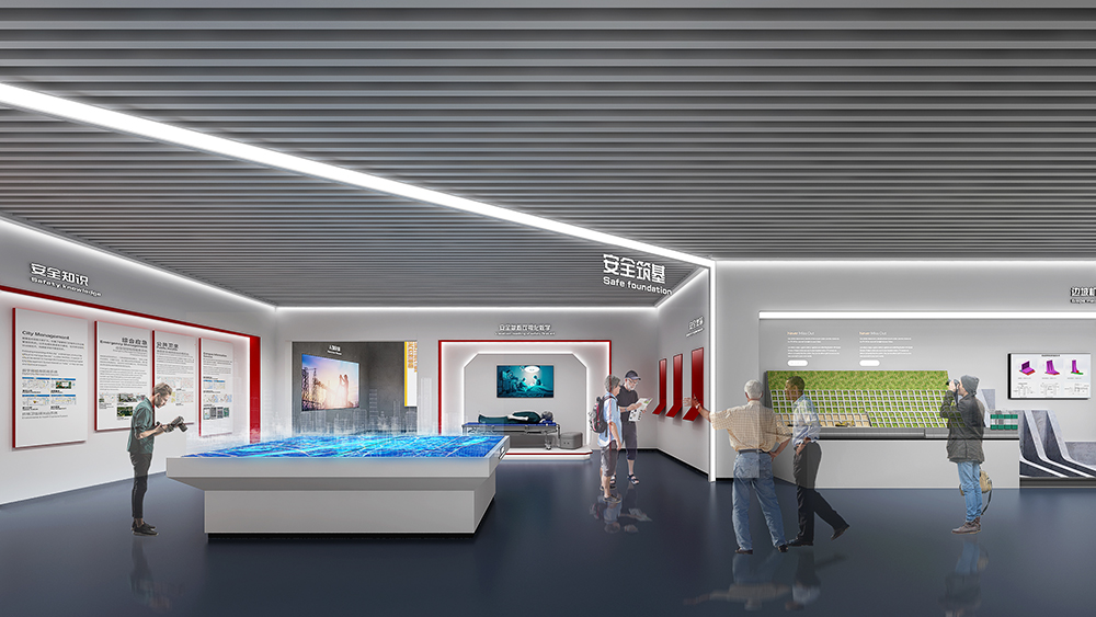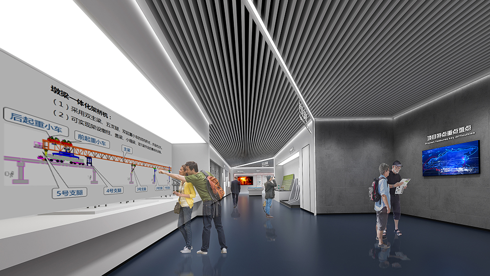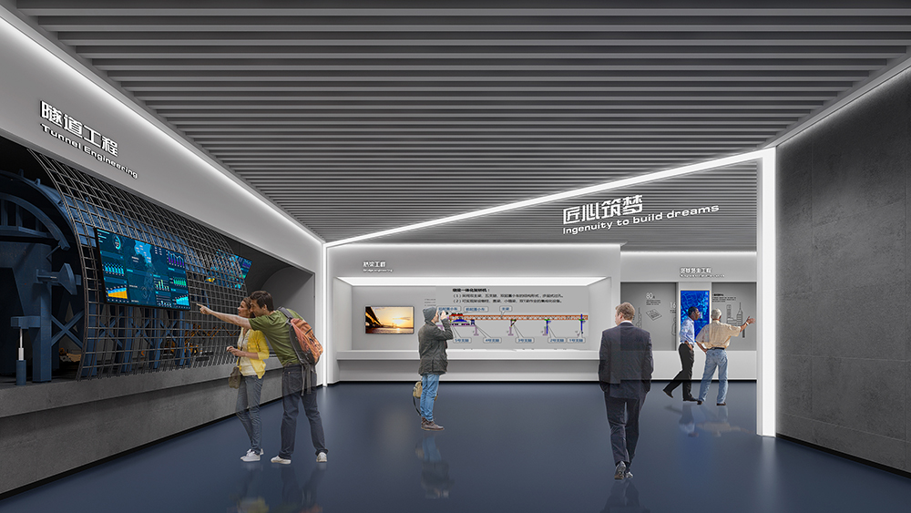 中鐵十四局深汕西改擴(kuò)建展廳為深汕西改擴(kuò)建9標(biāo)展廳,該標(biāo)段橋隧、路面工程量大,機(jī)械化程度高,須投入大量先進(jìn)智能機(jī)械設(shè)備;隧道地質(zhì)條件復(fù)雜,安全風(fēng)險(xiǎn)大,隧道斷面大,圍巖條件差,水文地質(zhì)條件復(fù)雜,存在不良地質(zhì),施工安全風(fēng)險(xiǎn)大;路面施工安全風(fēng)險(xiǎn)高,路面施工要在不中斷交通的情況下進(jìn)行,安全風(fēng)險(xiǎn)較高。在策劃設(shè)計(jì)時(shí)以中鐵十四局的“爭先尚干、不畏艱難、搏擊進(jìn)取、永不言敗”航海精神為指引,乘風(fēng)破浪,始終奮戰(zhàn)在條件最艱苦、人民最需要的地方。展廳從黨建融合、匠心筑夢、安全筑基、凝心聚力四大板塊內(nèi)容,結(jié)合多內(nèi)體互動(dòng)技術(shù),完美呈現(xiàn)了修舊如新,修舊超新的建設(shè)理念。